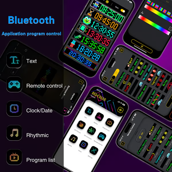 le panneau LED est contrôlé par une application connectée via Bluetooth, qui prend en charge la connexion simultanée de plusieurs écrans LED, rendant votre magasin plus attrayant. L'application intègre de nombreux modes et animations intéressants. Votre téléphone vous permet de personnaliser facilement des modèles et des textes amusants pour personnaliser votre magasin.