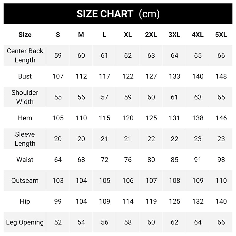 Tailles : S, M, L, XL, 2XL, 3XL, 4XL, 5XL