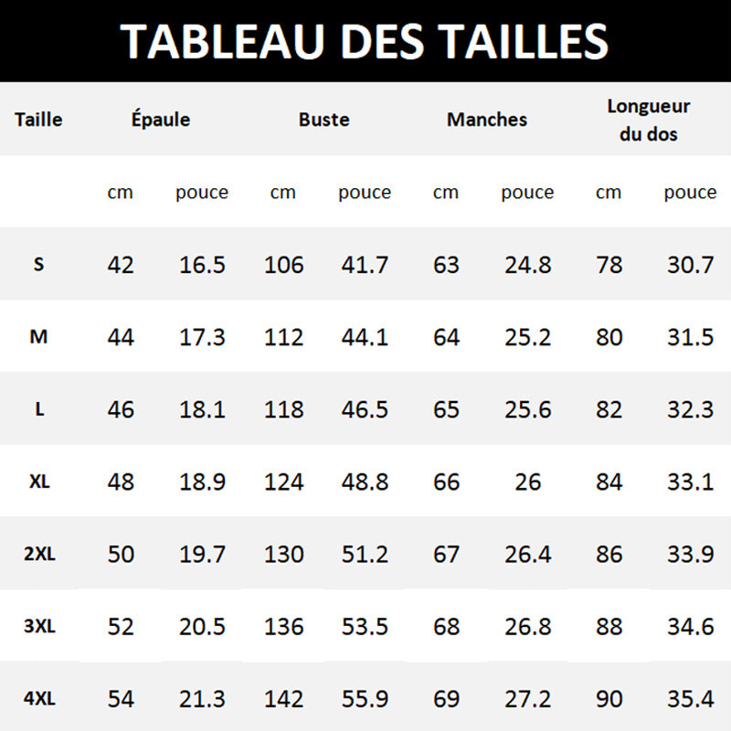 Taille : S, M, L, XL, 2XL, 3XL, 4XL
