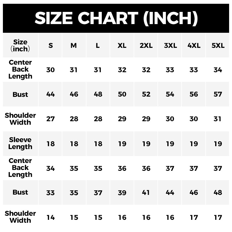Tailles : S, M, L, XL, 2XL, 3XL, 4XL, 5XL
