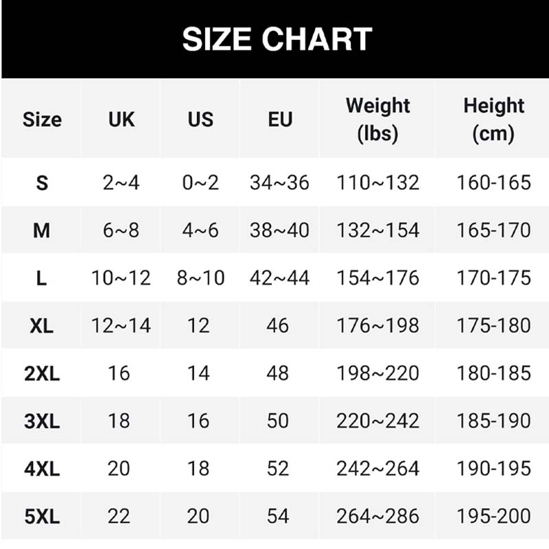 Taille : S, M, L, XL, 2XL, 3XL, 4XL, 5XL