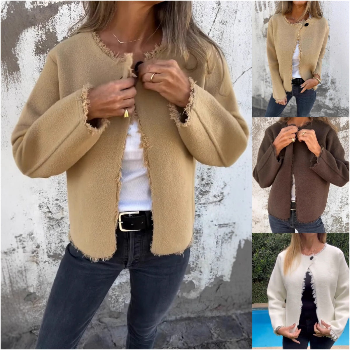 DECORATIVE FRAYED EDGES FOR A TRENDY LOOK: This jacket is designed with frayed edges at the cuffs, neckline, and opening, offering a chic, textured detail that enhances its casual yet stylish appeal for any occasion.
